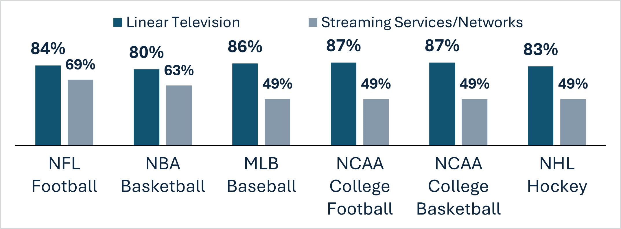 The data shows a double-digit advantage for linear TV across every sport measured. In some cases, including MLB and college sports, linear leads by nearly 40 points.