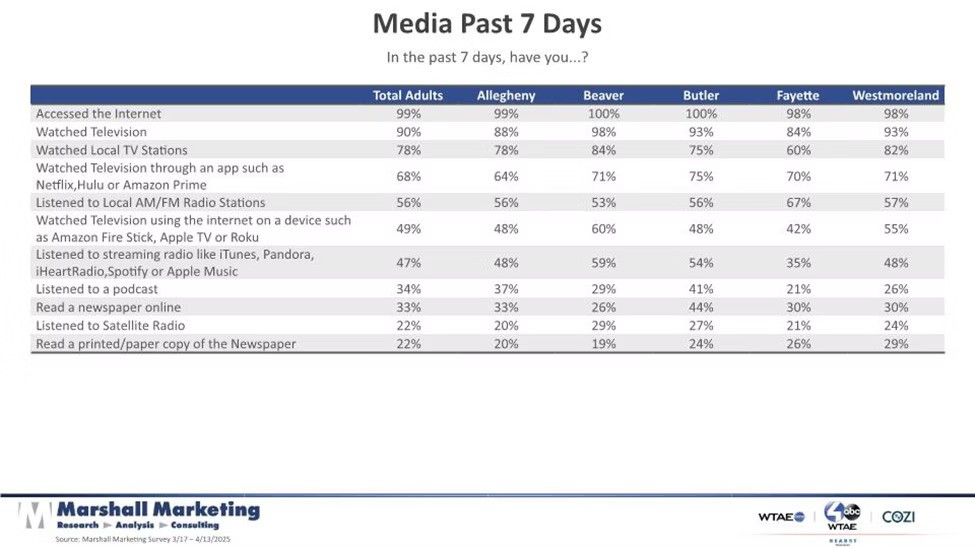 According to Marshall Marketing data, Pittsburgh-area adults are actively engaged across multiple screens: