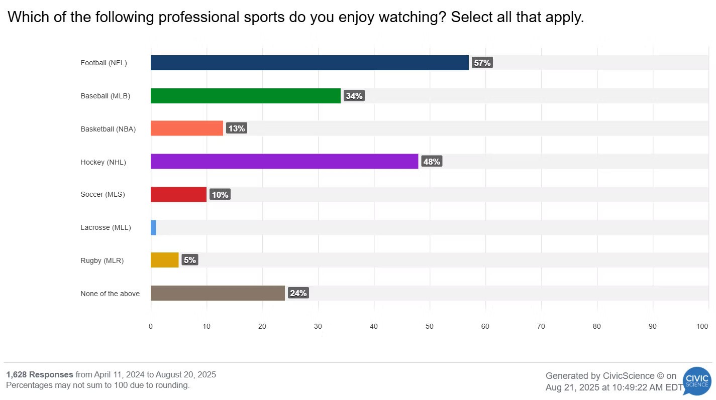 According to CivicScience, 57% of Pittsburgh adults say they enjoy watching NFL football, making it the most watched professional sport in the region. Hockey ranks second, with 48% of adults engaged with NHL content. Baseball remains a strong third, with more than one-third of viewers engaged.